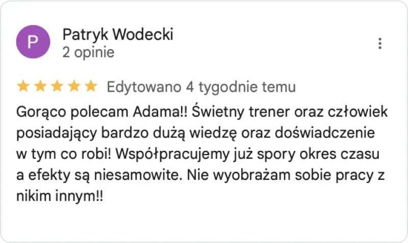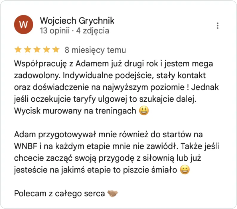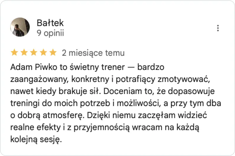 W mojej pracy stawiam na konkretny plan, realne wsparcie i maksymalną skuteczność. Wiem, jak frustrujące są treningi bez efektu, dlatego nie rozpisuję planów „na oko”. Działam z głową – żebyś wiedział, co robisz, po co to robisz i kiedy zobaczysz pierwsze efekty.