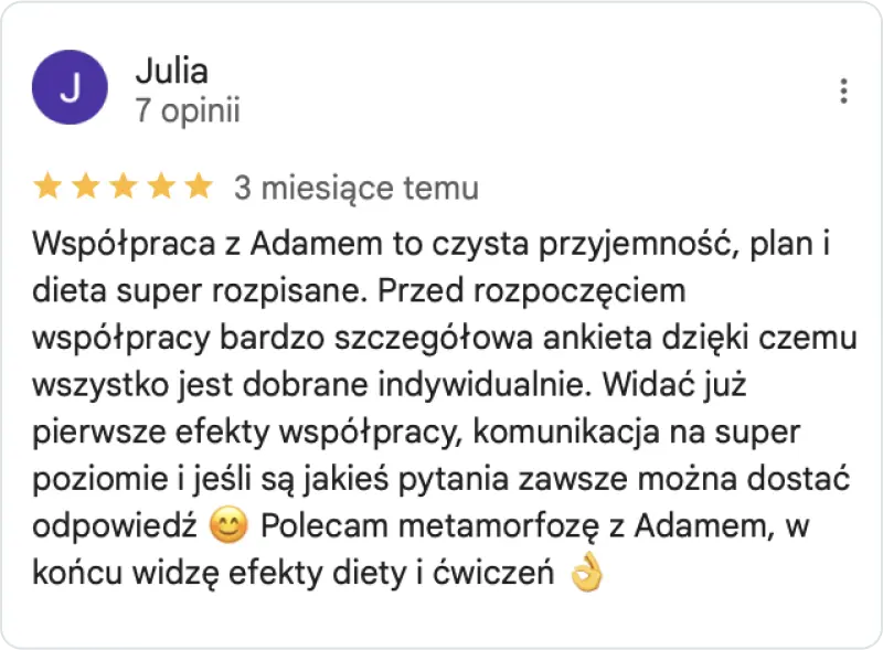 Nie ma dwóch takich samych osób – dlatego każdy mój podopieczny otrzymuje plan dopasowany do swoich potrzeb, celów i stylu życia.